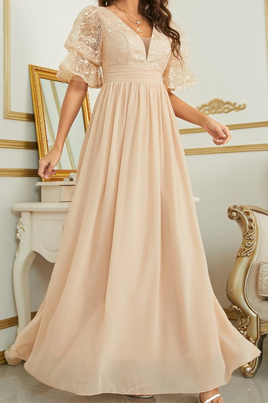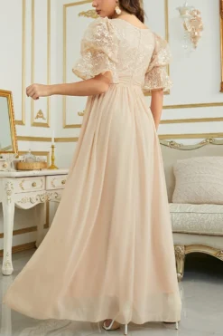 Elegant slight stretch v-neck lace stitching chiffon maxi dress