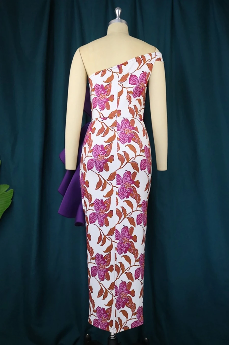S-4XL plus size slight stretch one shoulder printing zip-up slit sexy maxi dress
