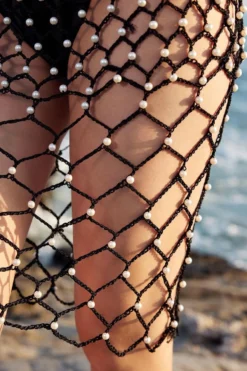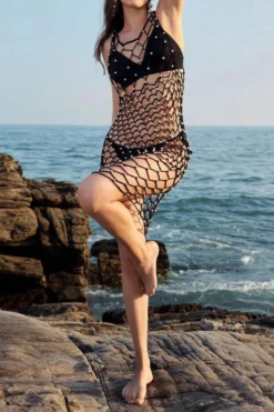 Sexy hollow woven fishnet pearl slim midi dress cover-up(only cover-up)