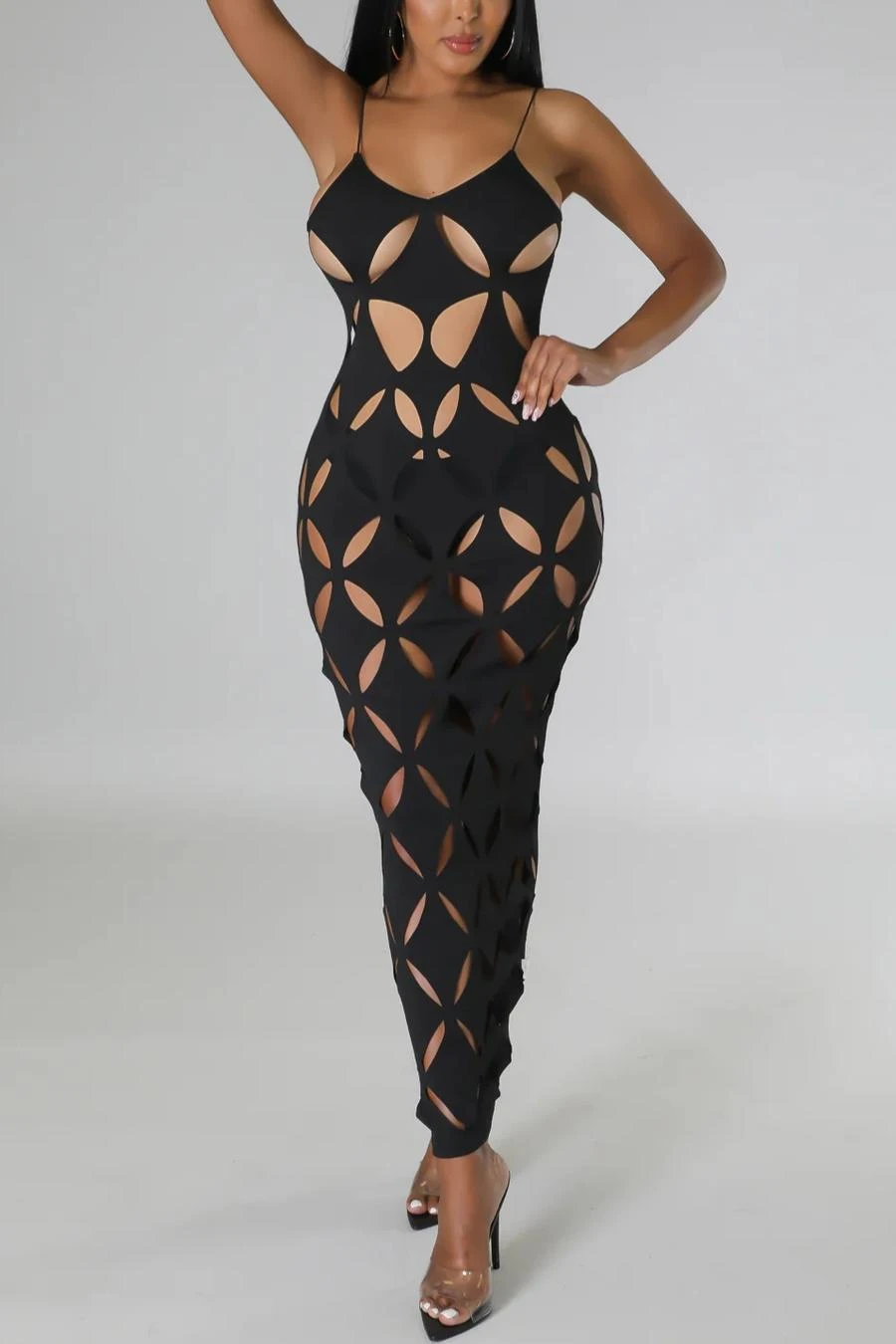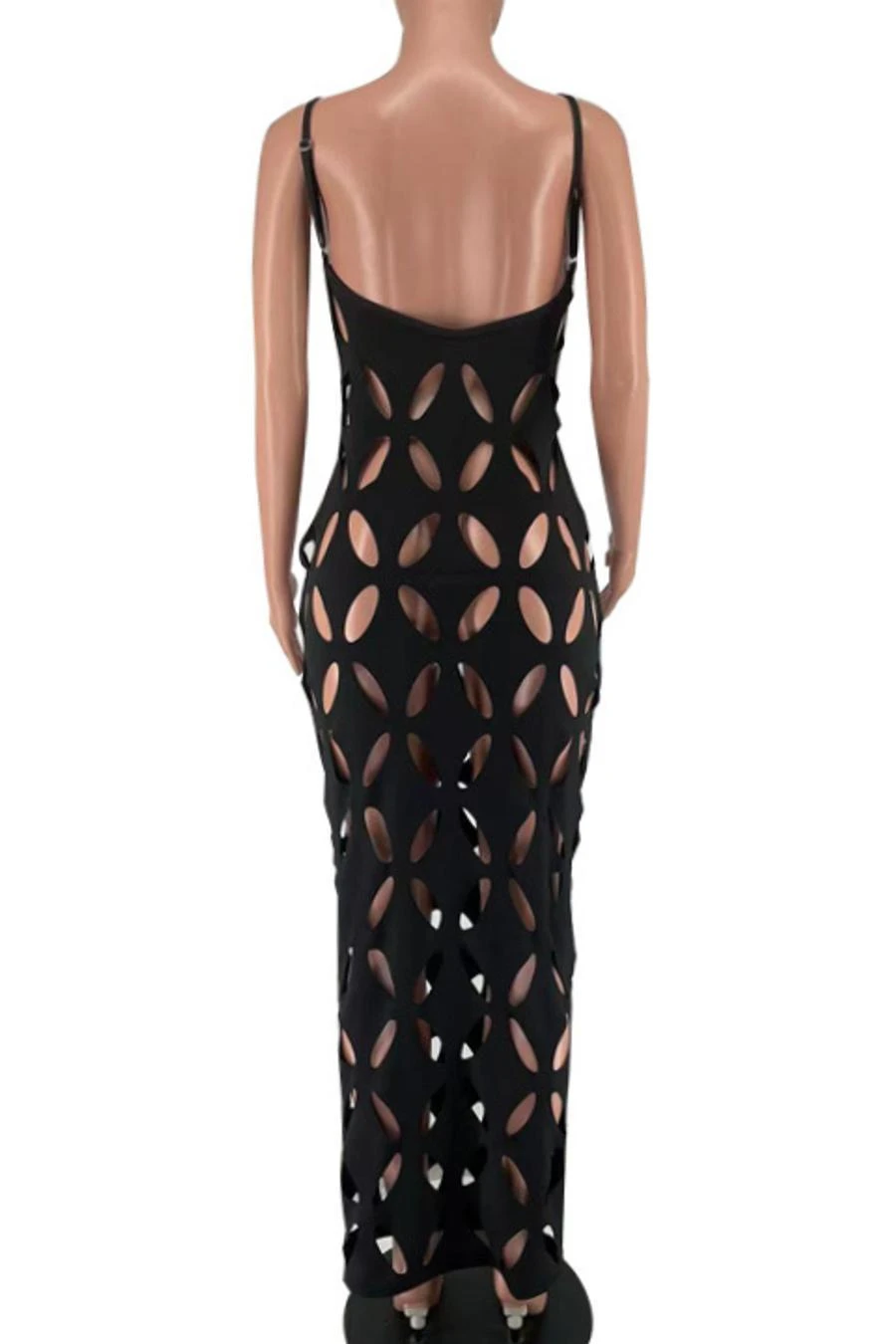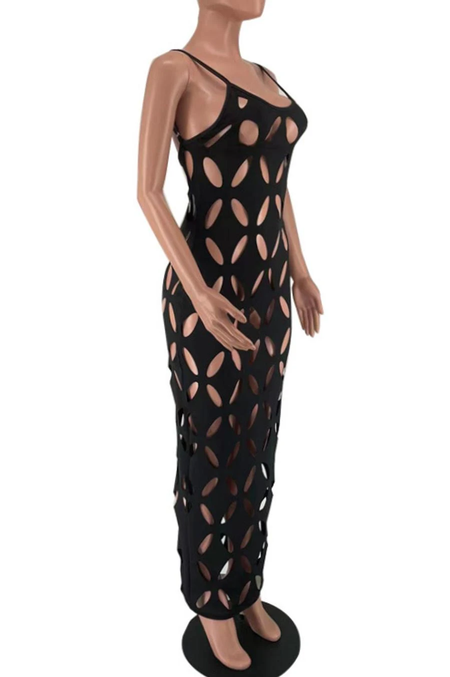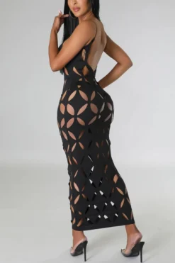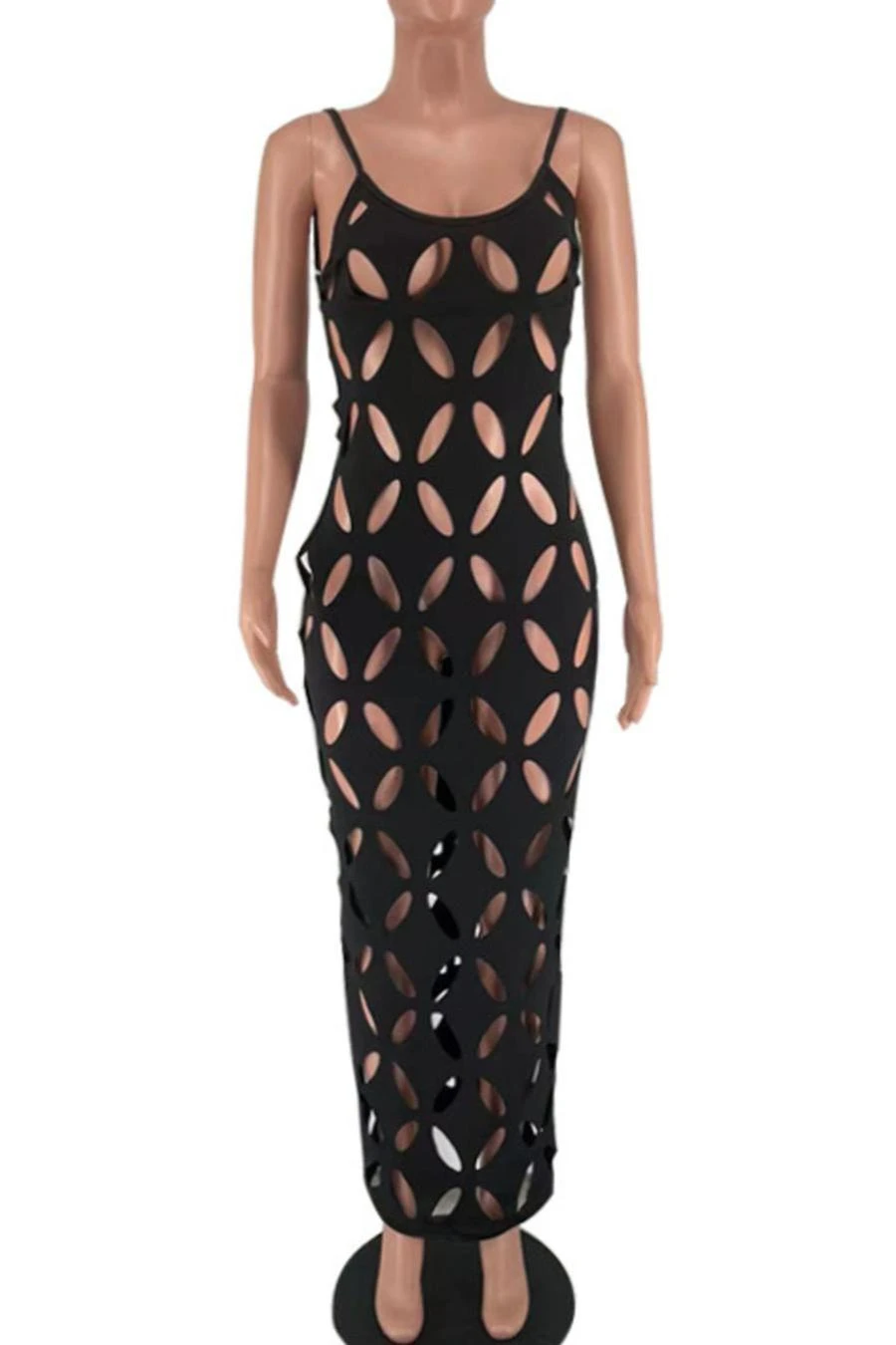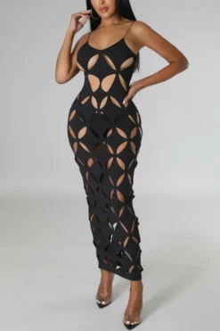 Sexy plus size slight stretch solid color hollow sling maxi dress