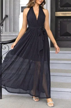 Sexy slight stretch glitter halter neck backless zip-up belt maxi dress